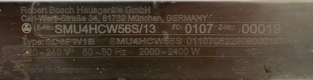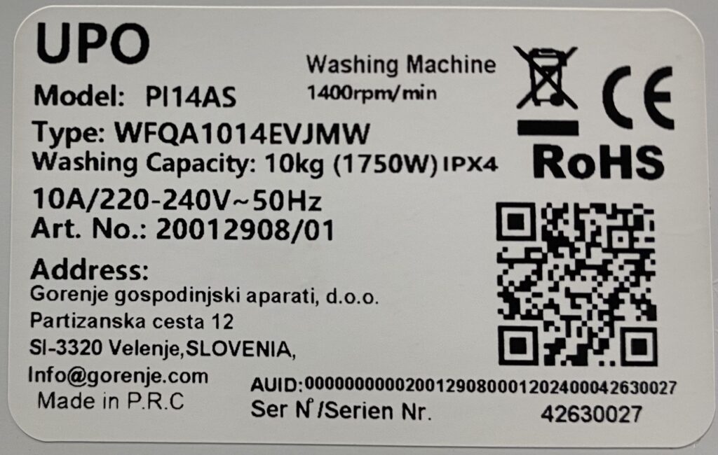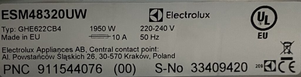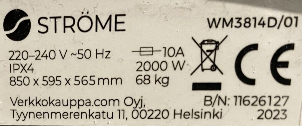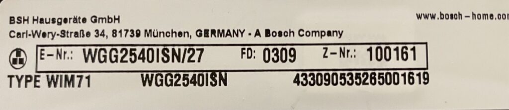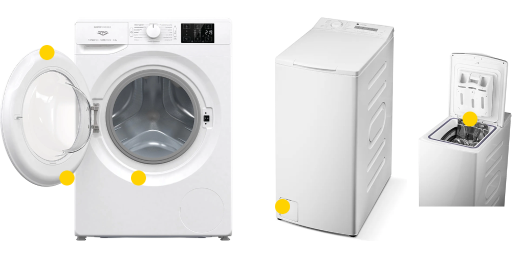 Edestä täytettävässä pyykinpesukoneesa tyyppikilpi on tyypillisesti joko luukun sisäpuolella tai luukun alla.