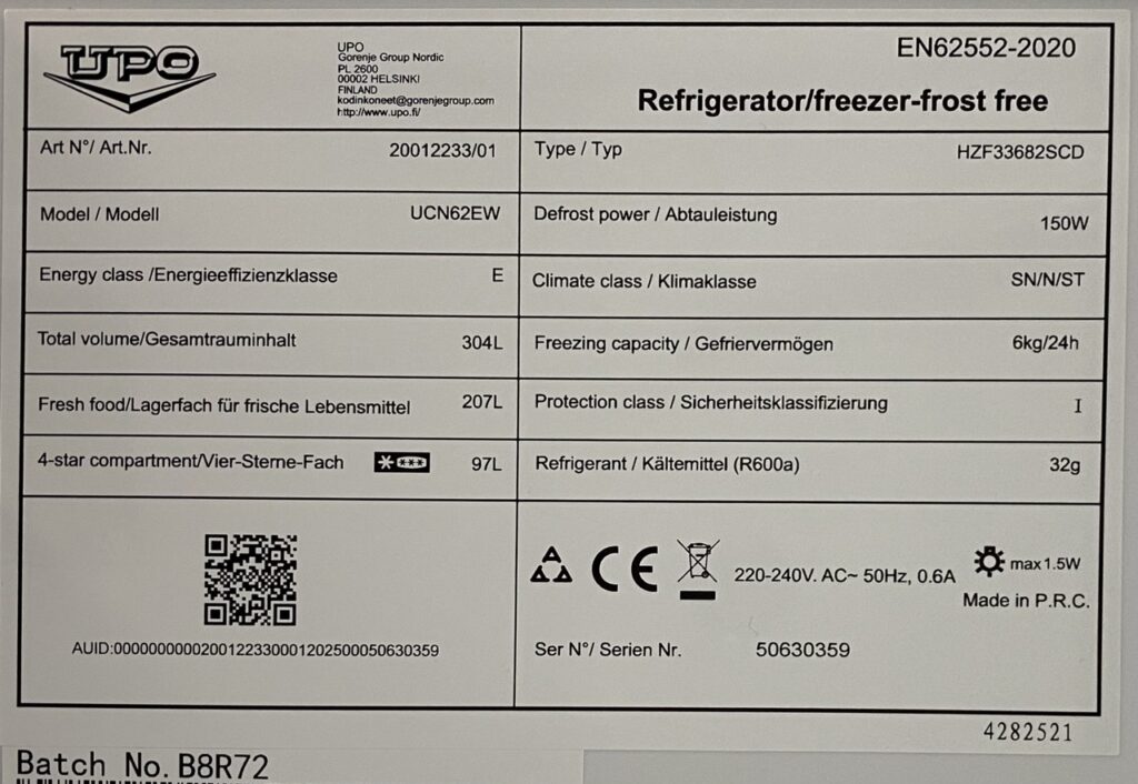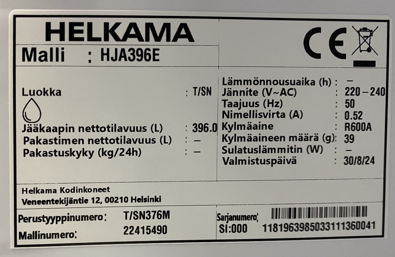 Jos kyseessä on pelkkä pakastin, tyyppikilpi on usein pakastimen ylimmän laatikon takana tai sivuseinässä.