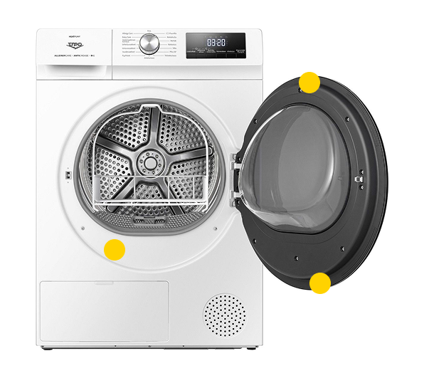 Kuivausrummussa tyyppikilpi on tyypillisesti joko luukun sisäpuolella tai luukun alla.